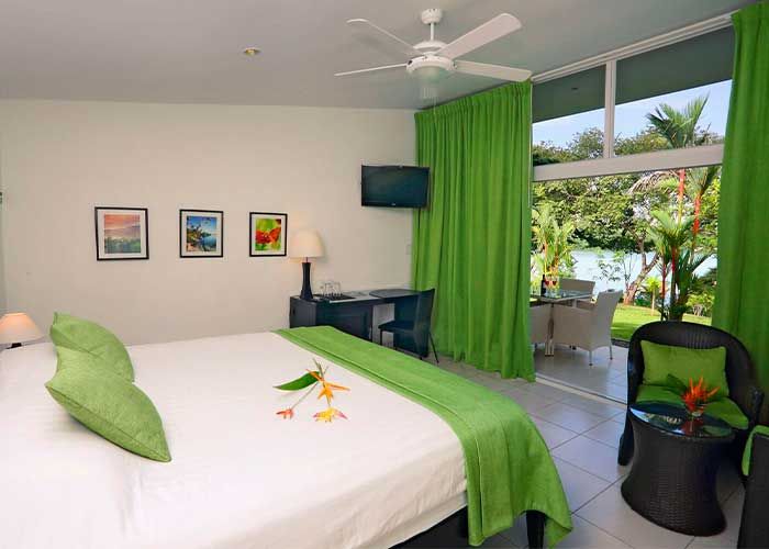 The accommodations consist of large bungalow-style guest rooms, or ‘cabañas’ as the Panamanians call them, architect-designed with a beautiful contemporary style. All bungalows are arranged in the hotel’s beautiful gardens, filled with tropical plants. The views stretch toward the shimmering sky-blue water just a few steps away. The swimming pools, restaurant and guest parking are all close by and easily accessible to the rooms. All rooms feature panoramic, full views to the sea and gardens, en suite bathroom with beautiful views, large shower and separate bathtub, private outdoor porch with table & chairs, air-conditioning and ceiling fan, satellite TV, minibar, safe among other amenities.